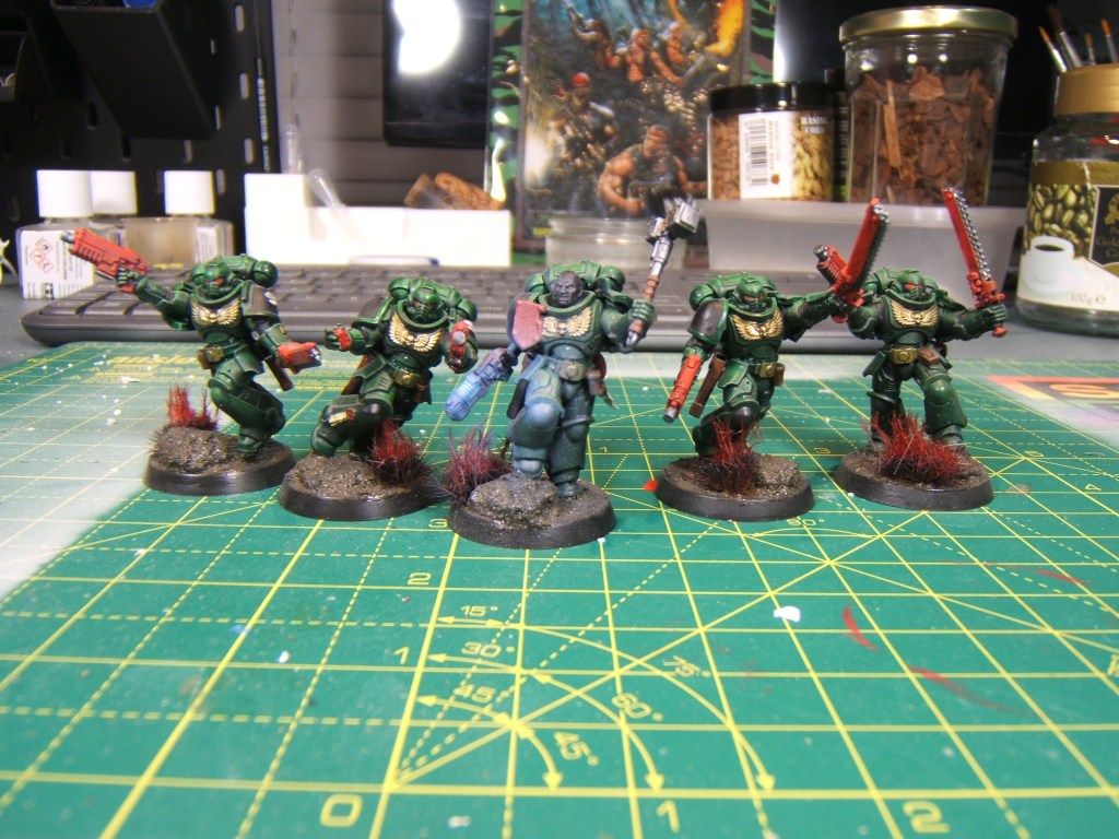 These are the first Space Marine units that I painted, and one of the first set of models that I painted using contrast paints. Having painted them all the way back in summer of 2024 I can’t remember exactly the scheme that I used, but I do know that the green is Dark Angels Green and I used a brush to apply it over a zenithaal highlight applied with an airbrush.