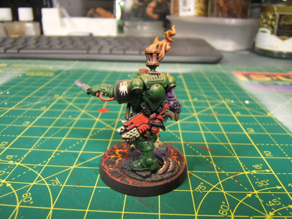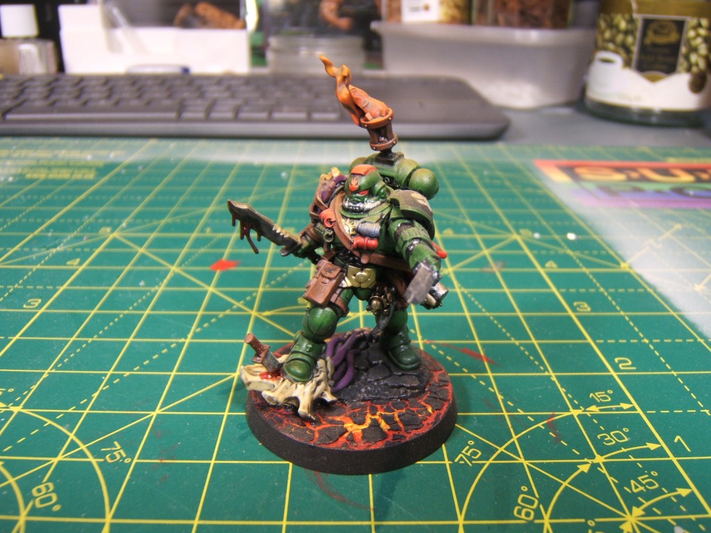 This week are some space marine characters that I painted over time for my Salamanders army. A Chaplain, an Apothecary, Bray’arth Ashmantle (Proxy for a Terminator Heavy Weapon / Captain) and a Phobos Lieutenant