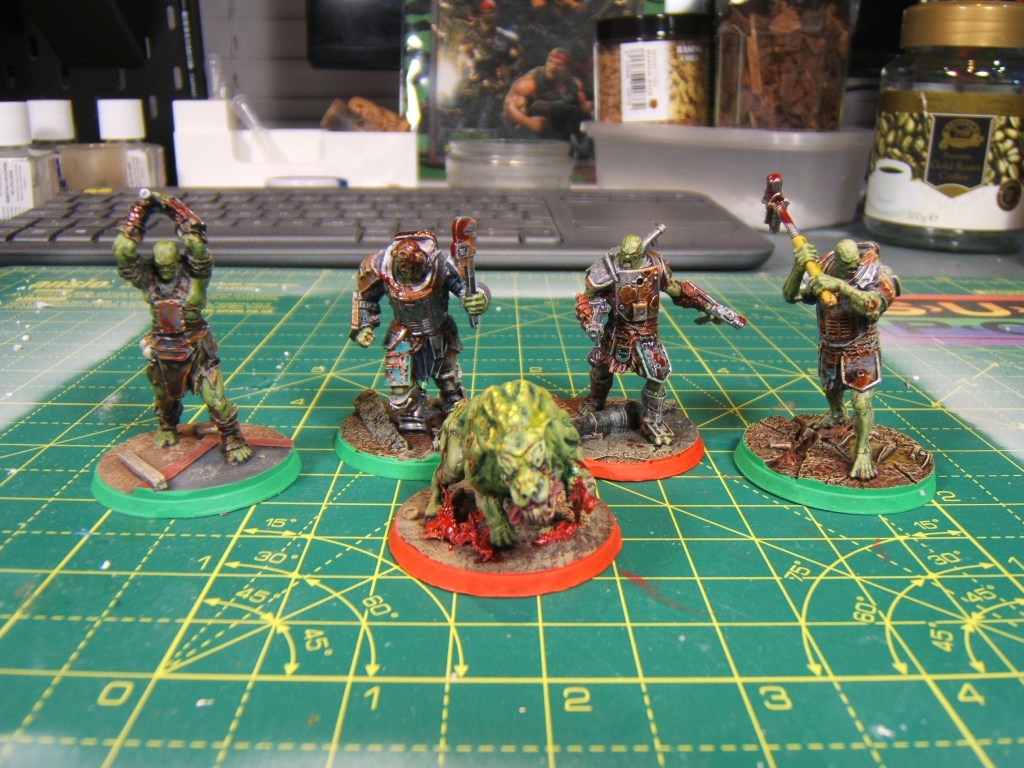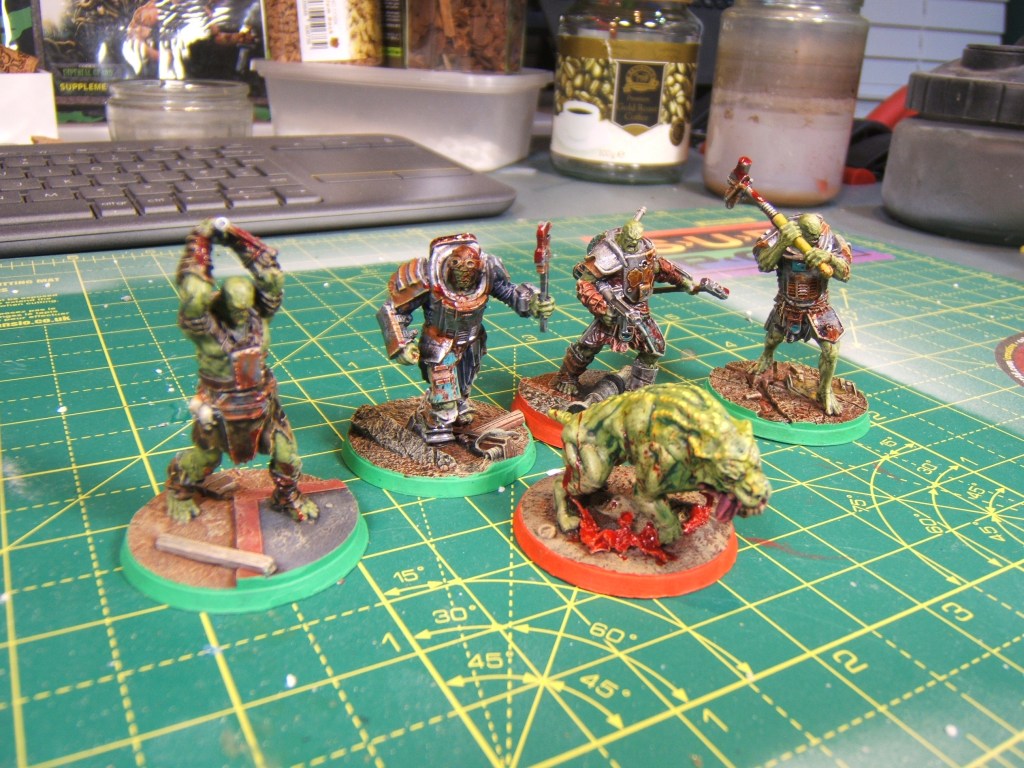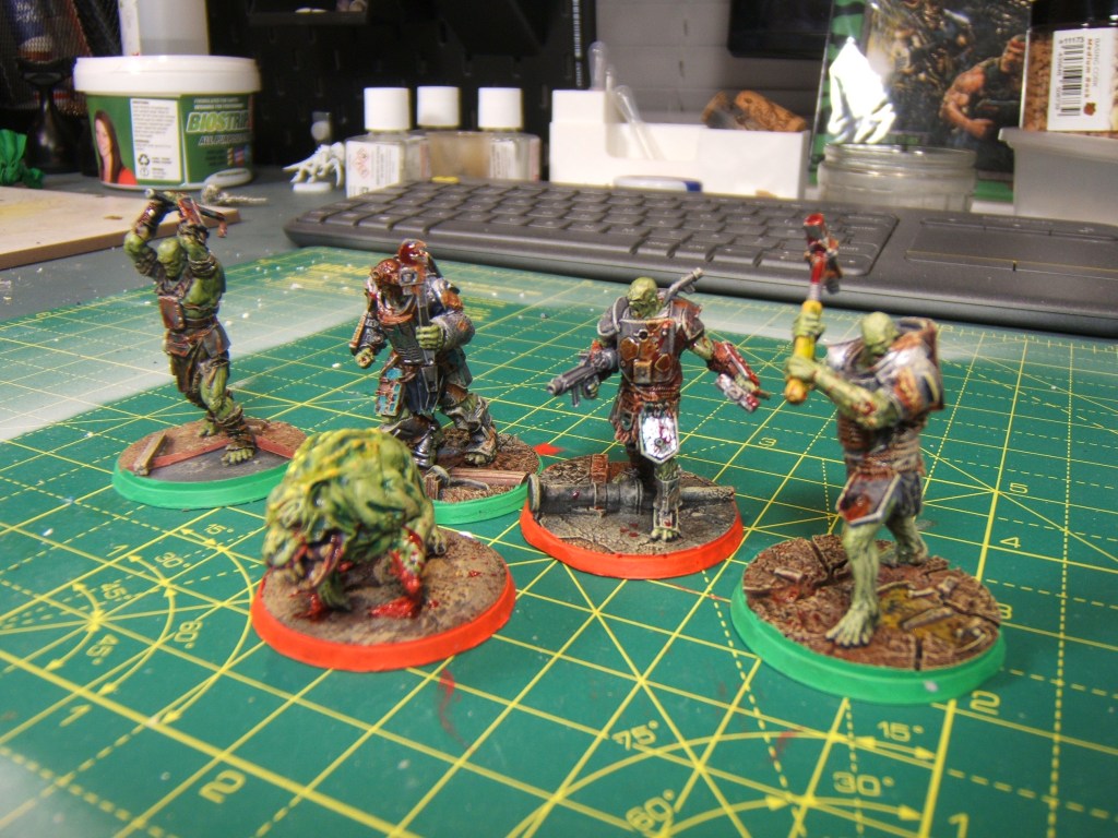 Wasteland Warfare was/is a great little skirmish game, more story driven than Killteam but not quite as reliant on having a consistent playing group like Necromunda or Mordheim (two games that I would love to get to play at some point!) The red bases on these models signify leaders, which was what seemed to be a pretty important mechanic that we never got around to actually using all that much!