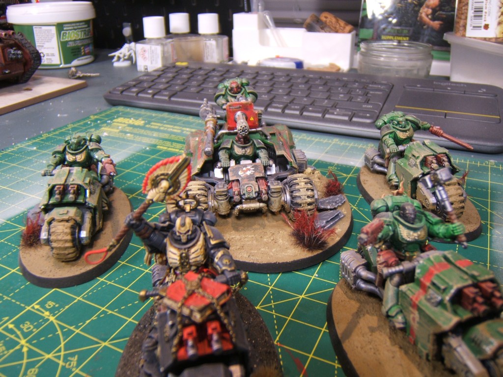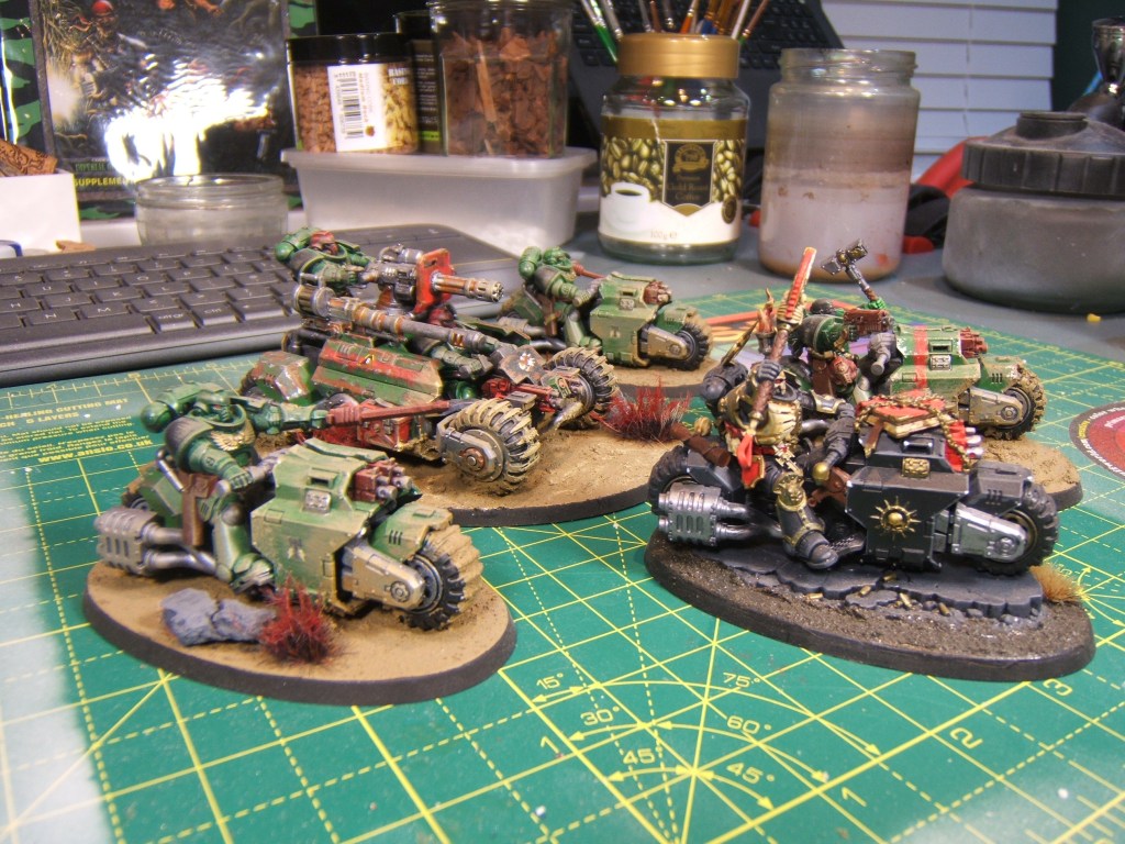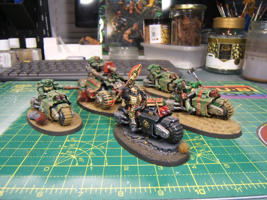Overall I really enjoyed painting and basing these models, and I think they turned out fantastic. In game they’re pretty good, and they certainly gave my friend’s Custodes a seconds pause when they first went up against one another (although I still got absolutely thrashed). With the chaplain attached these bikes hit real hard in melee, and with the right detachment and enhancements they can be a real menace with advance and charge or stealth to get them right in the action or keep them unharmed.
